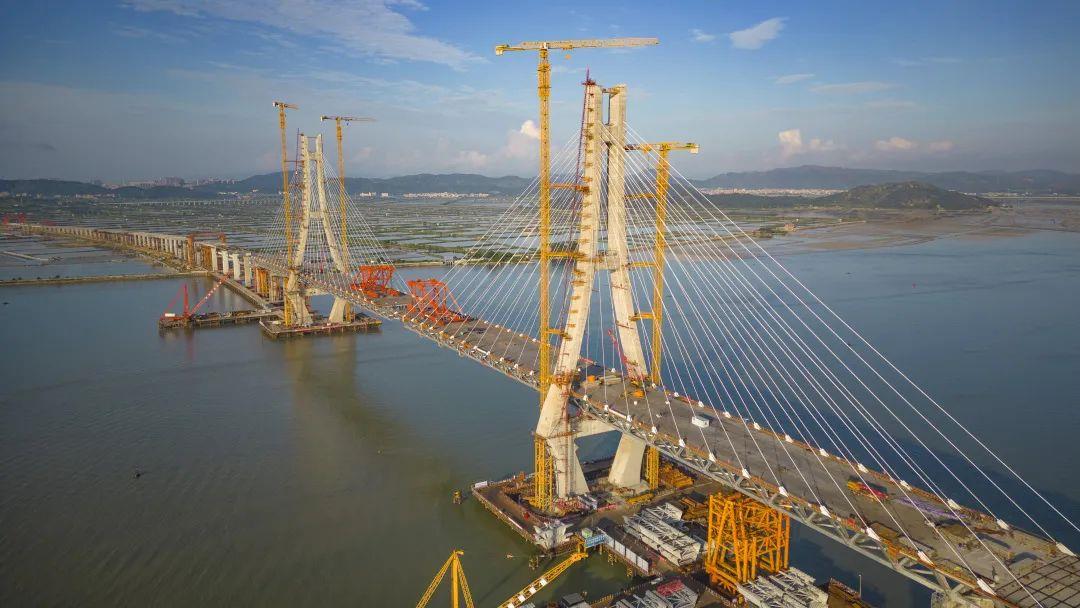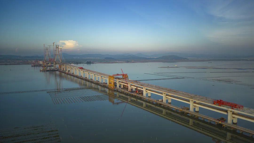 牛田洋公轨共建特大桥是牛田洋快速通道重要组成部分,主桥全长955米、主跨468米,两个水中主塔塔高均为182.9米,设计为极富潮汕地方特色的厝头和翔鹭造型,目前为粤东境内主塔最高、跨度最大的双塔双索面钢桁梁斜拉桥。