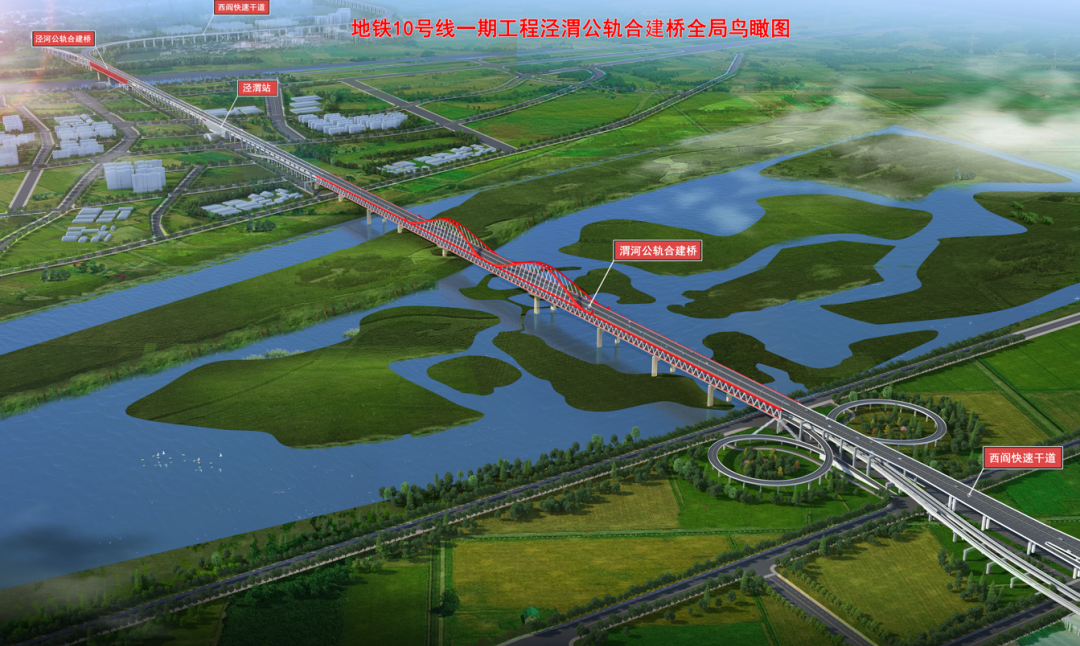 西安地铁10号线公轨合建桥项目,为西阎快速路与地铁十号线合并建设,项目全长7千米,跨越渭河至泾渭半岛,其中包含渭河特大桥、泾渭站、泾河大桥等公轨合建大桥共3.5千米,是一条集城市快速路、城市辅路、慢行系统、轨道交通四种交通功能为一体的综合交通走廊。
