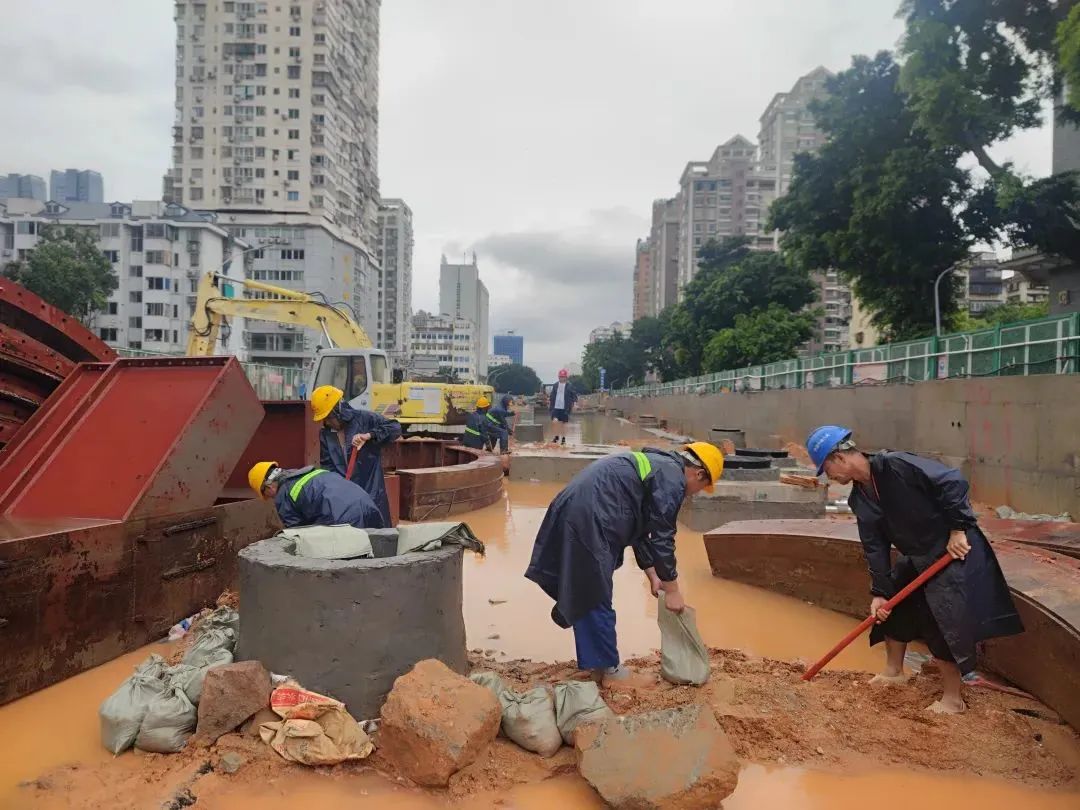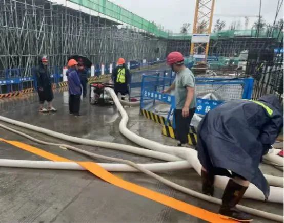 与此同时,为防止基坑长时间泡水,引发安全风险,福州地铁项目部成立“排水抢险小组”,提前完成驻扎,并预先配备了抽排能力达200立方米/小时的超压排水泵六台、抽排能力达80立方米/小时的高压燃油泵,人机待“汛”,随时启动抽排水作业。7月29日凌晨,一轮又一轮暴雨开始侵袭,施工现场多处被淹,排水抢险小组同时启动十六台“吸水王”加快抽排现场积水,与此同时组织人员凿通水沟、打掉挡墙、清理堵塞物,紧急疏通各处积水。29日下午,雨势减小,项目全员手持扫帚、火钳、铁锨等工具,清理加固倒伏的围栏、围挡,排查临电线路,归置设备设施,清扫路面淤积泥水,并“地毯式”排查因暴雨造成的生活生产设施损毁情况,及时启动全方位恢复施工。到29日23时30分,项目部驻地、工人生活区、钢筋加工场、各施工区域均已恢复正常。
