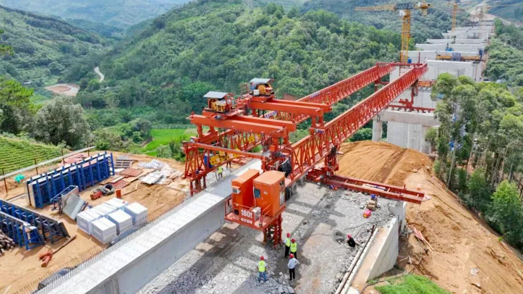 广东阳信高速公路是广东省重点项目,项目线路全长141.91千米,横跨2市3县12镇。其中白塘岭隧道位于高州市,设计为双向六车道分离式隧道,隧道左洞全长2282米,V级围岩占比达20%,开挖断面大,施工难度大;下竹山大桥全长860米,设计桥面净宽15.5米,为双向六车道,此次架设的预制T梁是下竹山大桥左幅第二十四跨,该梁长40米,重100吨;北界大桥位于信宜市北界镇,桥长947.2米,上跨省道S283及部分居民房屋,安全风险高,施工组织难。