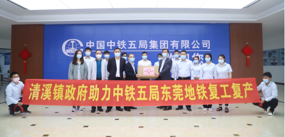 3月11日,东莞市清溪镇招商局副局长彭祖寿一行到滨江体育馆站调研,向坚守复工复产一线的地铁参建人员表示慰问,并赠予项目部2000个医用口罩,助力疫情防控和施工生产。