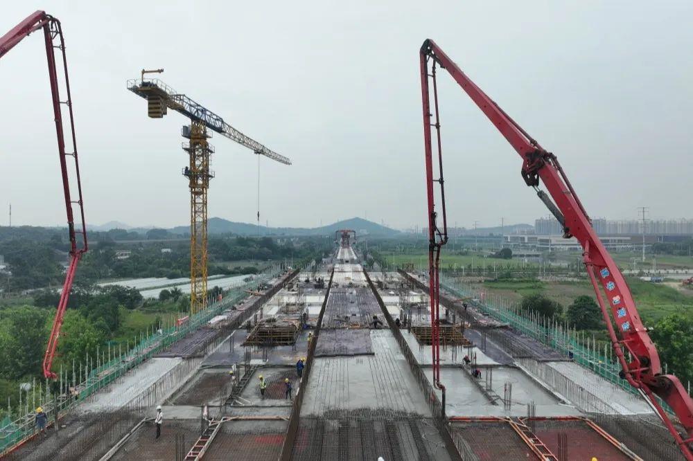 7月14日,由中铁上投投资、中铁四局施工的宁马城际铁路(马鞍山段)最大站体——采石河站承轨层结构顺利浇筑完成,为完成年度目标打下了坚实基础。采石河站主体站房位于安徽省马鞍山市江东大道与采石河交接处南侧,附属用房设于江东大道东侧,天桥出入口设于江东大道西侧。站房主体结构沿江东大道呈一字型布置,为路中高架三层侧式站台车站,为越行站,其中一层为站厅层、二层为站台下夹层(承轨层)、三层为站台层。车站总长120米,车站总宽37.6米,为宁马城际铁路(马鞍山段)最大站体。此次浇筑的是承轨层1至4轴,共计浇筑1130方混凝土,使用2台泵车同时浇筑。