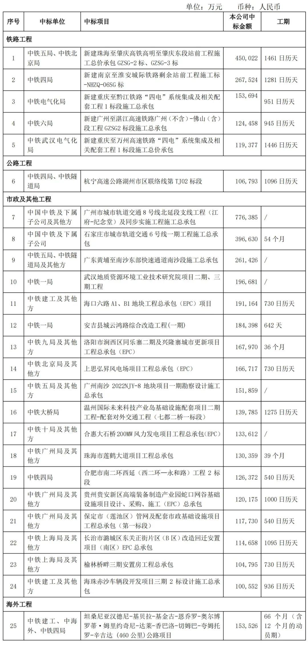 近日,中国中铁发布公告(编号:临2023-029),公司于近期中标多个重大工程,中标价合计约人民币