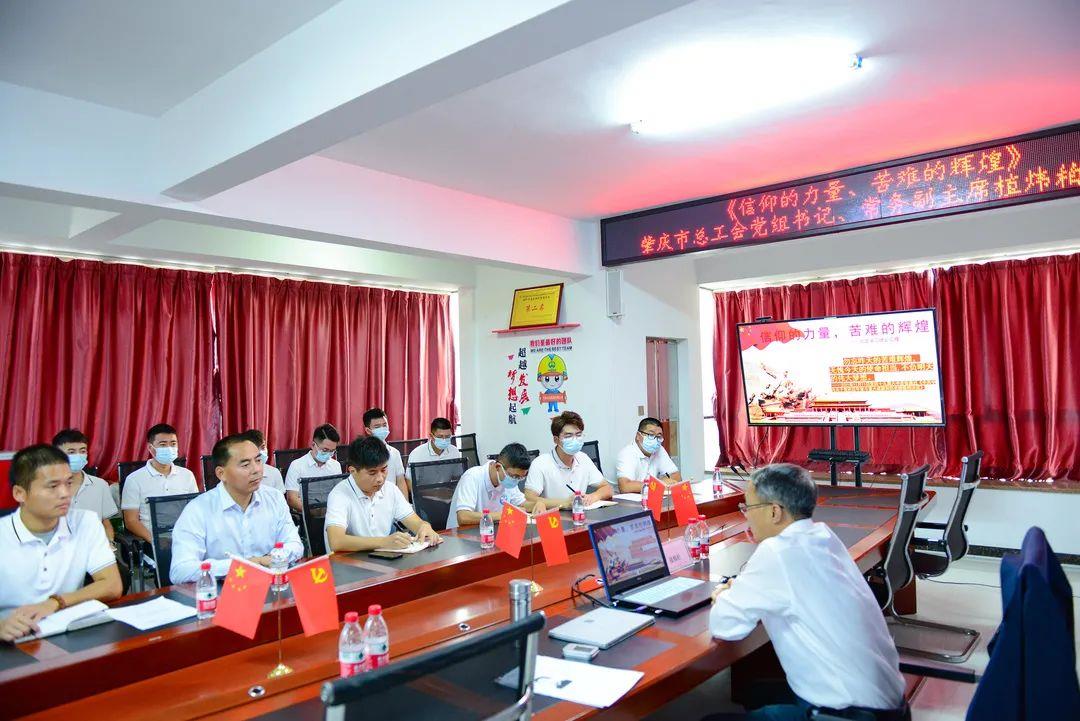 在中铁南方西江国际未来科技城项目部,肇庆市总工会党组书记、常务副主席植炜柏同志向项目部全体党员上了一堂主题为《信仰的力量,苦难的辉煌》党课。植炜柏同志首先与党员同志们一起学习了习近平总书记在党的十九届六中全会上的重要讲话精神和全会精神,接着,向党员同志讲述了我党的百年辉煌历程,勉励大家要发扬伟大的建党精神,在迈进笫二个百年奋斗的新征程上继续发扬吃苦耐劳、顽强拼搏的精神,以昂扬的斗志投入到肇庆经济社会建设当中,为推动肇庆与企业融合发展贡献力量。