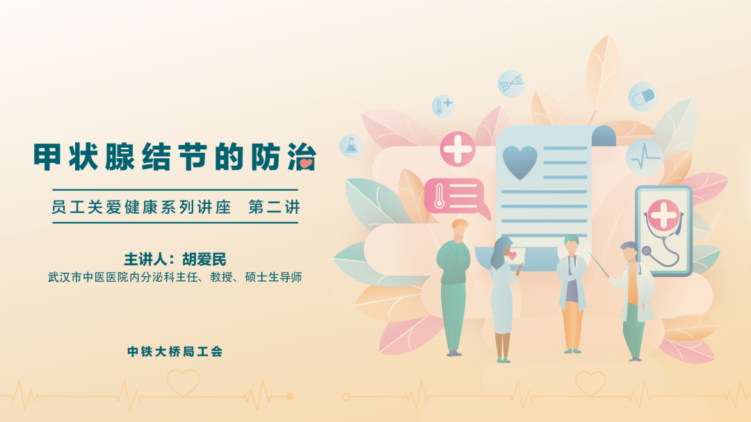 7月19日下午,中铁大桥局工会邀请武汉市中医医院主任医师胡爱民作了题为“甲状腺病防治”的讲座。胡主任从甲状腺解剖及生理、常见甲状腺病有哪些、甲状腺相关实验室检查有哪些、如何防治甲状腺结节四个方面,深入浅出地详细讲解了甲状腺疾病的相关知识及防治甲状腺疾病的主要措施。授课结束后,胡主任还与现场参与活动的员工进行了互动交流,耐心解答了员工们提出的有关健康问题。