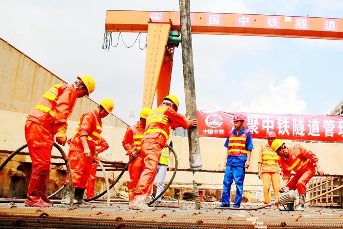 深圳地铁6号线南庄站施工现场,工人正进行车站主体工程最后一方混凝土的浇筑,该站成为地铁6号线首个主体结构顺利封顶的地下车站。