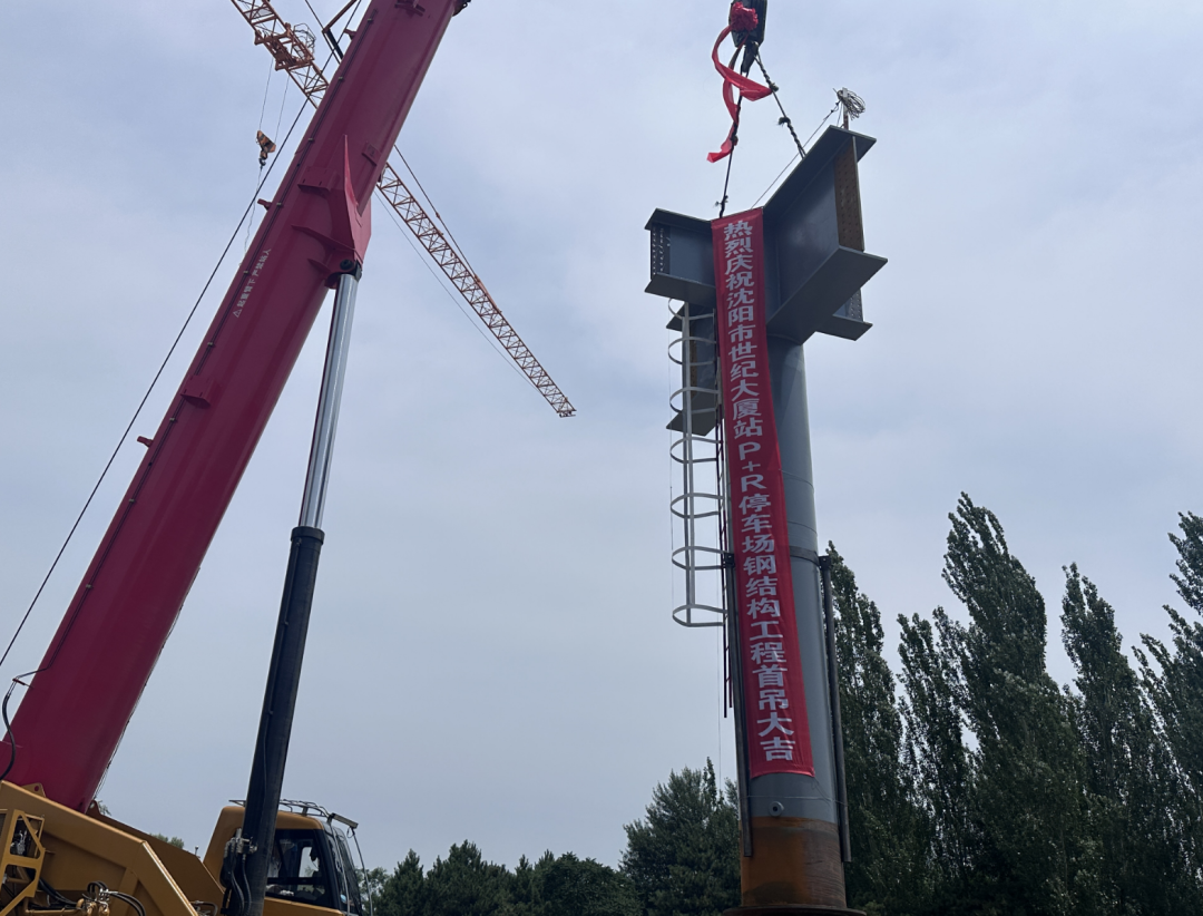 沈阳动静态交通PPP项目部承建的世纪大厦站P+R停车场首根钢立柱安装完成