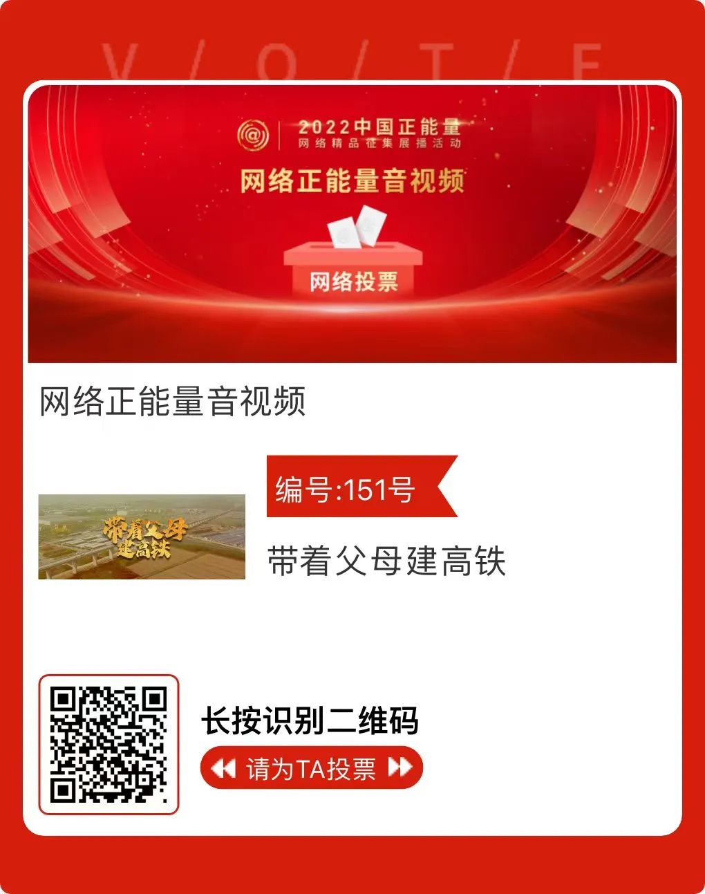 以正能量引领亿万流量,用主旋律奏响奋进乐章。近日,中央网信办主办的2022中国正能量网络精品征集展播活动网络展播投票开启啦!由中国中铁报送的短视频作品《带着父母建高铁》入选。