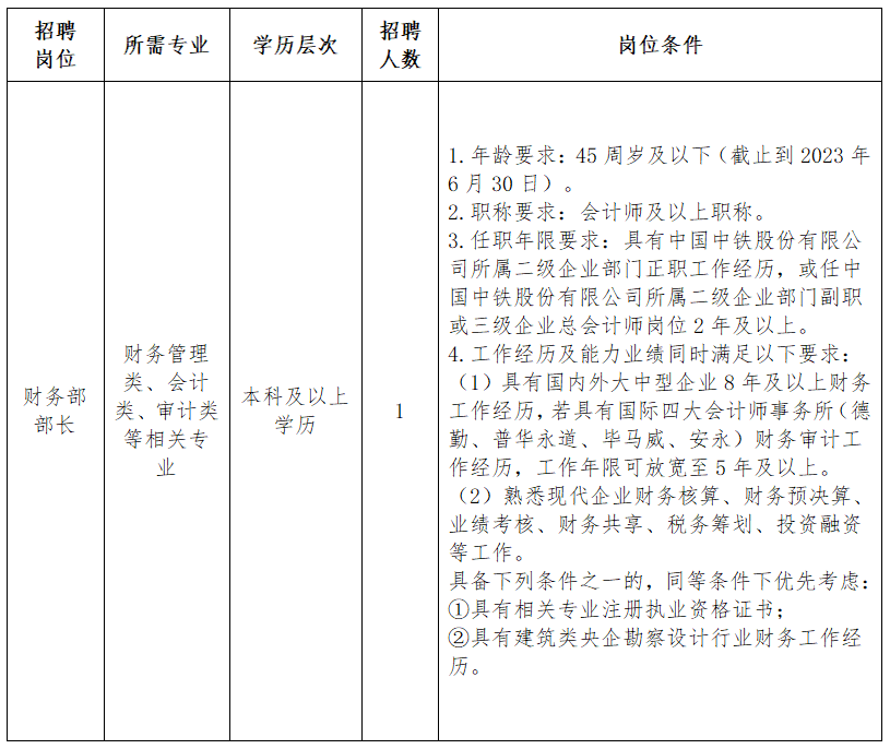 根据公司发展战略,为增强人才队伍核心竞争力,满足公司业务快速增长对人才的需求,现面向社会公开招聘市场经营岗人才2名,面向中国中铁系统公开选拔财务部部长1名,具体公告如下。