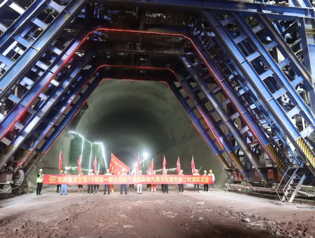 重庆轨道交通15号线一期全线首个暗挖车站九曲河东站二衬主体结构如期完成。该车站坐落于重庆市渝北区,采用复合式衬砌结构,共有3种衬砌结构类型。针对车站衬砌结构形式多样,车站主体开挖与衬砌步距、九重区间与车站主体交叉施工、车站内交通组织等施工难题,重庆轨道指挥部多次组织召开技术交流会,推广应用先进工艺工装,进一步强化施工技术保障,同时协同参建单位多次开展技术研讨,全过程介入提供技术支持,合理优化台车设计方案;严格按照“仰拱先行、拱墙整体衬砌、开挖有序推进”的原则,全面落实衬砌台车安全措施,循序渐进地完成车站418平米超大断面二次衬砌及双层牛腿施工,有效地保障了车站衬砌结构施工质量。