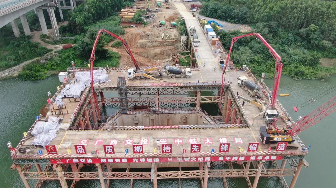 9月2日,由中铁大桥局承建的新建柳州至广州铁路柳州至梧州段(简称柳梧铁路)控制性工程盘龙柳江特大桥主桥33#主墩承台开始混凝土浇筑施工,标志着大桥又一重要里程碑节点顺利完成。柳梧铁路建成后,对于完善区域铁路交通运输网,实现桂中地区更好融入粤港澳大湾区具有重要意义和作用。