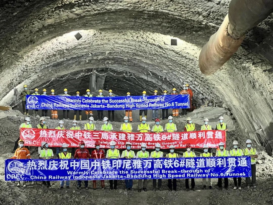 中国中铁承建的6号隧道位于万隆市西北侧普瓦卡达县境内,全长4478米,是全线最长的一座隧道。隧道位于低山丘陵区,地质为早期火山喷发堆积而成的黏土、泥岩、火山角砾岩,隧道内地下水位高,隧道上方长距离穿越浅埋层,施工难度较大。中国中铁采取超前地质预报、增设锁脚、边墙注浆等多种工法,保证施工进度和施工安全,并于2022年2月18日实现全隧贯通。
