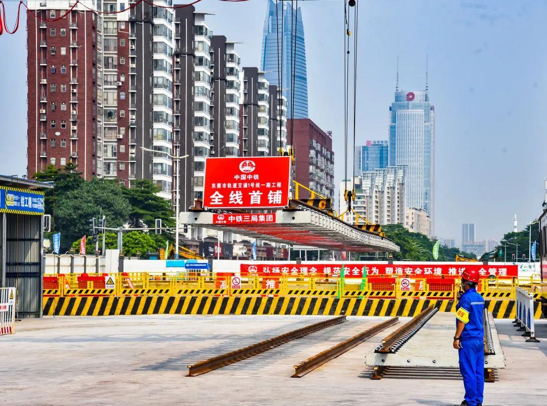 2022年7月30日,在东莞轨道交通1号线新源路站铺轨基地施工现场,随着一声令下,两台大跨度龙门吊将第一节25米长的轨排稳稳吊起,平移至下料口,并精准地铺设在轨道板上,标志着由中国中铁以PPP合作模式建设,中铁三局承担铺轨任务的东莞轨道交通1号线由土建施工全面进入站后施工新阶段。