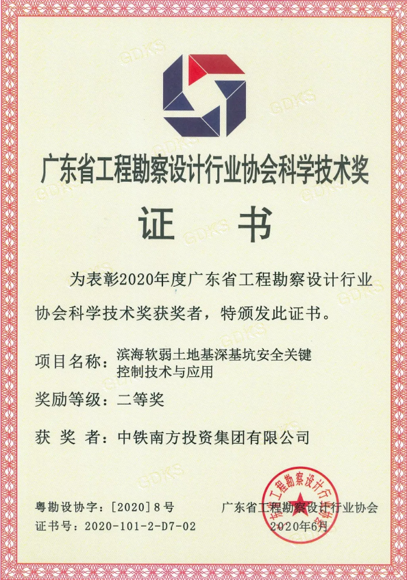 日前,广东省工程勘察设计行业协会公布了2020年度科学技术奖获奖名单,由中铁南方等为主要完成单位的研究成果《滨海软弱土地基深基坑安全关键控制技术与应用》荣获2020年度广东省工程勘察设计行业协会科学技术二等奖。该成果提出了滨海深厚软土地层深基坑开挖新方法,研制了基坑无线监测系统,填补了软土深基坑采用激光技术无线监测的空白,在广佛江快速通道江门段茶坑隧道等工程项目中得到成功应用,经济效益和社会效益显著。