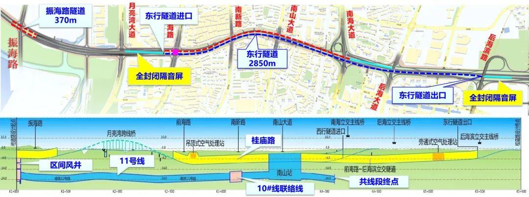 深圳桂庙路快速化改造工程穿越前海及南山临海片区,周围建筑物林立,需穿越多座桥梁及地铁2号线、9号线,还与地铁11号线共线,设计条件复杂,控制要求高、施工难度大。其中,地下道路采用明挖隧道穿越南山桂庙片区,与运营的地铁11号线平面重叠,重叠共线长度达3公里,地下道路结构底与地铁盾构顶最小距离6米,是国内在建与地铁共线距离最长的明挖施工城市地下道路。