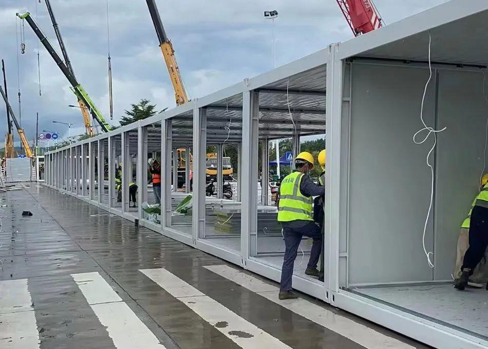 8月15日晚上,中铁南方与区域各单位先遣人员连夜赶往现场,紧急调集隔离房建设物资,争分夺秒,迅速进入“战斗状态”,15日晚10时,已到位200余间隔离房建设物资,施工人员立即投入到隔离房搭建中,数百名中铁建设者奋勇鏖战,经过昼夜施工,截至17日晚,提前完成了首批200间隔离区板房的搭建,为阻击疫情赢得了宝贵时间,助力海南省奋力夺取疫情防控全面胜利。