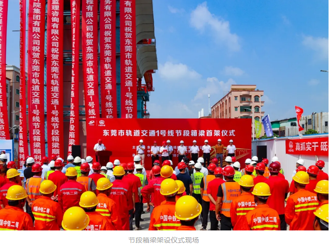 东莞市交投集团党委副书记、总经理张庆文、东莞市轨道交通局副局长任智武,中国中铁华南区域总部(中铁南方)副总经理张国亮、东莞指挥部指挥长王太平,中铁二局华南指挥部指挥长晏大武,以及建设、设计、监理等相关单位、建设者代表参加了此次节段箱梁首架仪式。