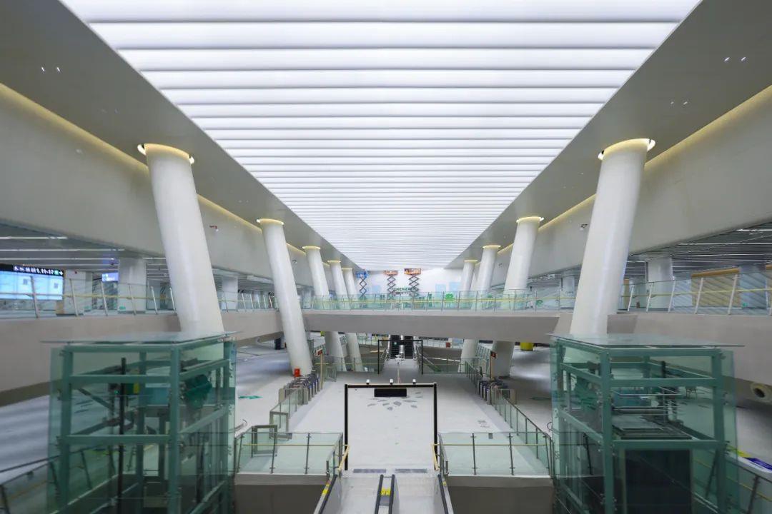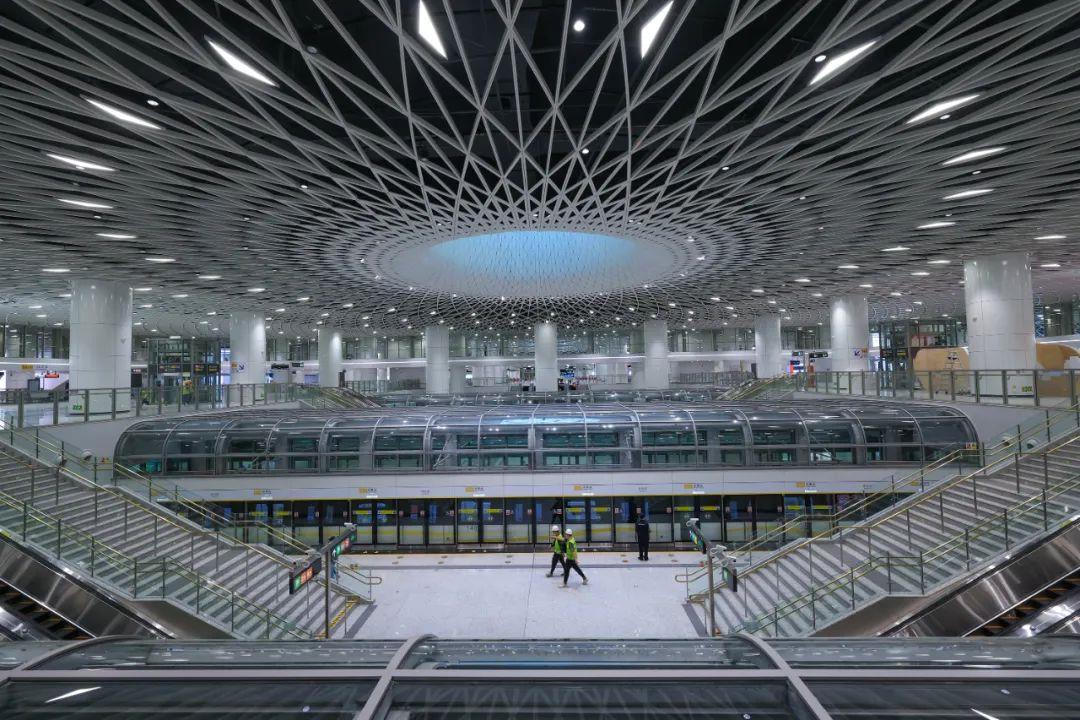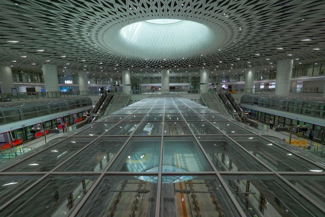 “深圳之眼”岗厦北枢纽为深圳首个一次性建成连通五条线路的综合交通枢纽,结合城市地下空间体系、市政功能、轨道交通、文化景观等要素进行一体化建设,实现了“四线合站”高效换乘。
