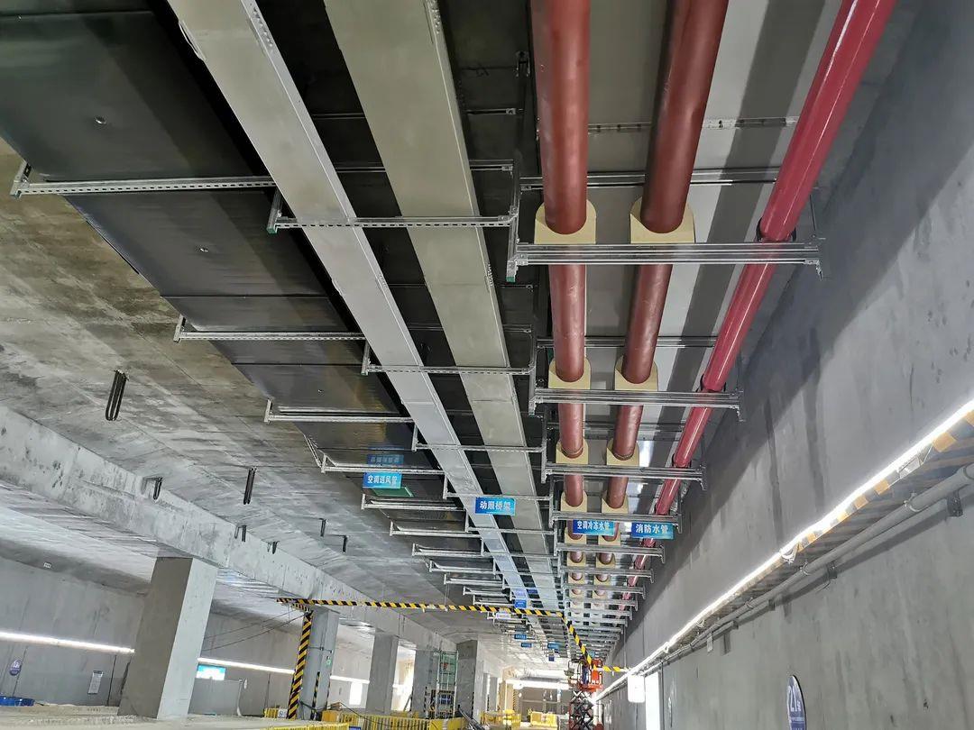 ▲站厅层内综合吊支架安装及风管、水管、线盒安装横平竖直、标识清晰