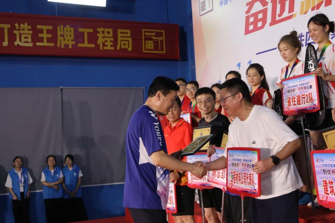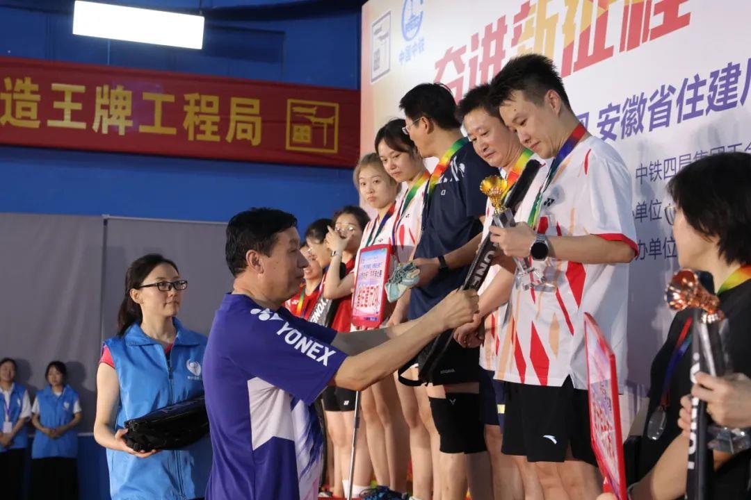 中铁四局工程材料公司党委书记黄玉华为设计院代表队、物资公司代表颁发季军奖杯