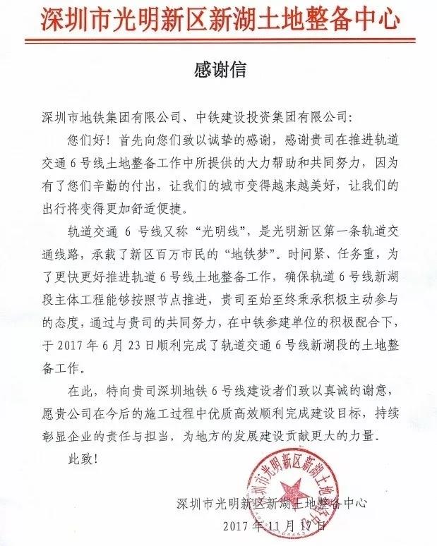 11月17日,深圳市地铁集团有限公司、中铁建设投资集团有限公司共同收到了一封来自深圳市光明新区新湖土地整备中心的感谢信,信中对两家单位在推进轨道交通6号线土地整备工作中所提供的大力帮助和共同努力表示诚挚的感谢,并向深圳地铁6号线建设者们致以真诚的谢意。