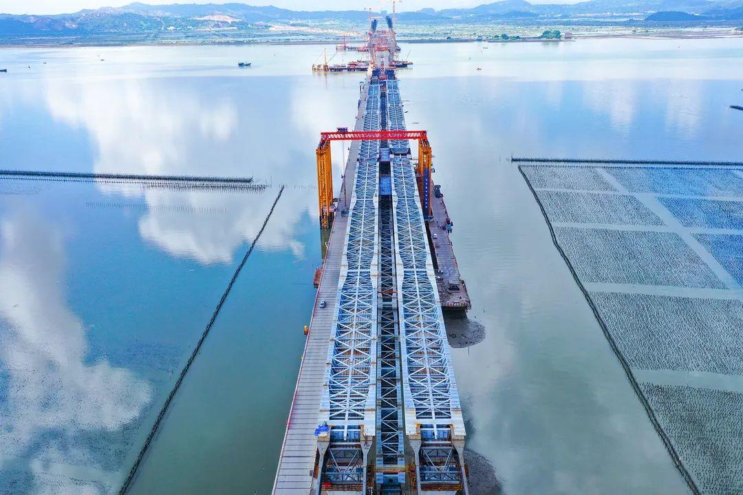 牛田洋特大桥是广东汕头牛田洋快速通道连通榕江南北两岸的跨江控制性关键工程。跨江段采用公路与轨道共建的双层设计,主跨采用公轨合建双塔双索面双层钢桁梁斜拉桥,主桥长955米,主塔高183米。牛田洋快速通道北连汕昆高速公路、南接汕湛高速公路,与汕昆、汕湛、沈海等高速公路共同形成汕头中心城区的快速外环;同时连接国道206、324线等多条国省道和城市主干道,建成后将成为汕头中心城区西部快速通道,对于改善城市交通基础设施条件,提升城市交通品质具有重要意义。