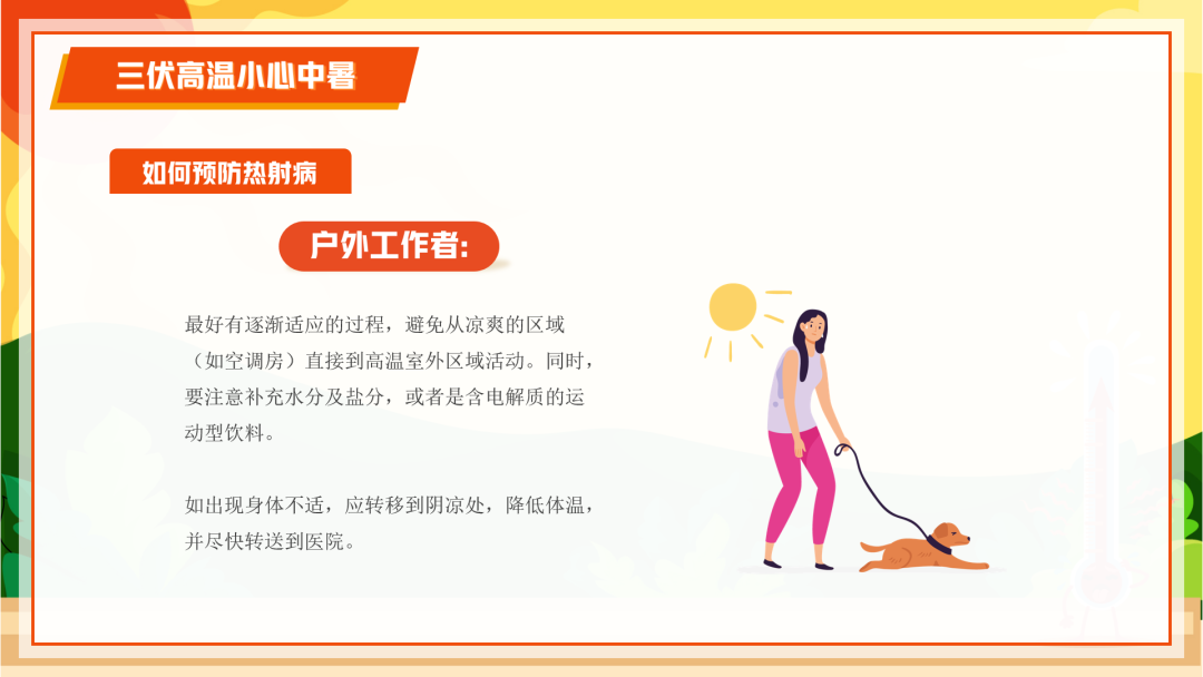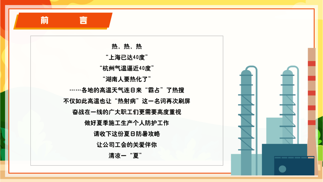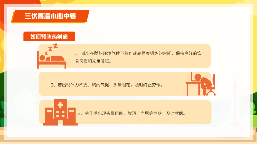 骄阳似火,酷暑难当,高温天气一天接一天。在高温的“烤”验下,中铁北京局生产一线上,激情似火,干劲十足,职工们工作热情丝毫未减。为保障大家的身心健康和劳动安全,确保广大职工平安度夏,中铁北京局北京公司健康委员精心制作了《清 凉 一“夏”——夏季施工生产防暑安全知识》EAP微课,全方位保障一线职工的身体健康。
