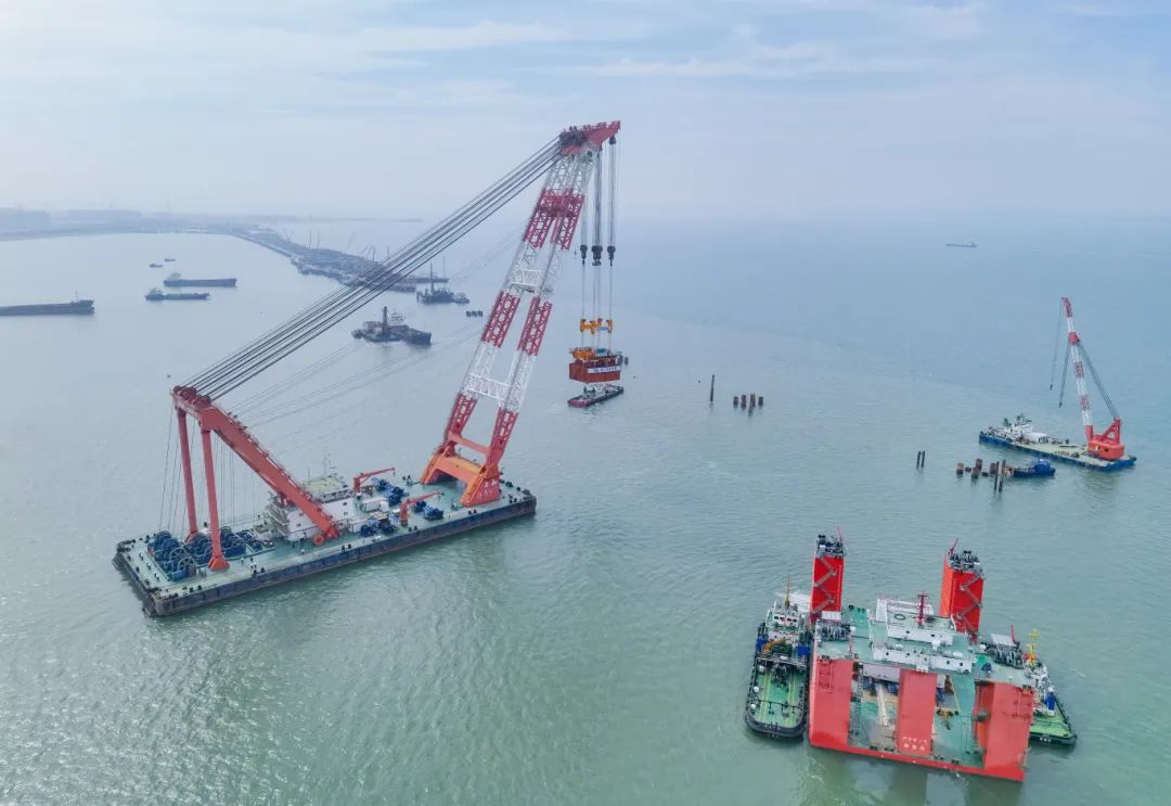 此次完成吊装的预制墩台体型庞大,长15.3米、宽11.6米、高4.5米,总重量相当于460辆标准货车的载重量。在预制构件运输筹备阶段,中铁南方项目管理团队组建网格化安全管理专班,深入预制构件厂开展发运前专项检查,从源头严把质量安全关,为运输及后续施工筑牢安全保障。同时,面对复杂的海洋环境,项目团队“逆风破局”,精准把握最佳作业窗口期,创新运用坐滩式整体导向定位平台进行钢管复合桩钢管施工。通过“整体座底+定位支撑桩”结构体系定位平台,并结合稳桩平台系统,采用三步定位法,有效将钢管桩平面和垂直度误差控制在极小范围内,为预制承台的安装精度与质量筑牢坚实基础通过。