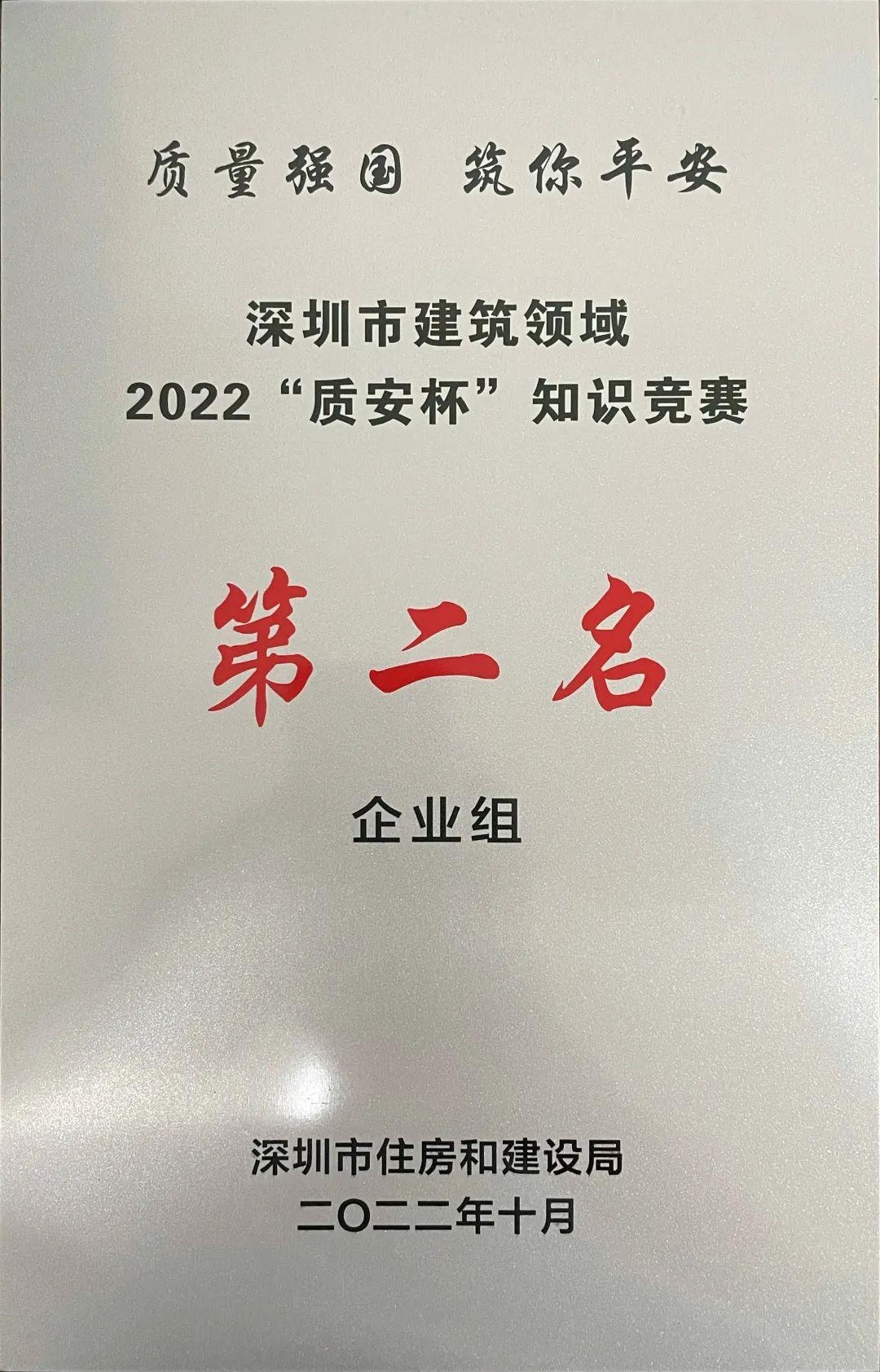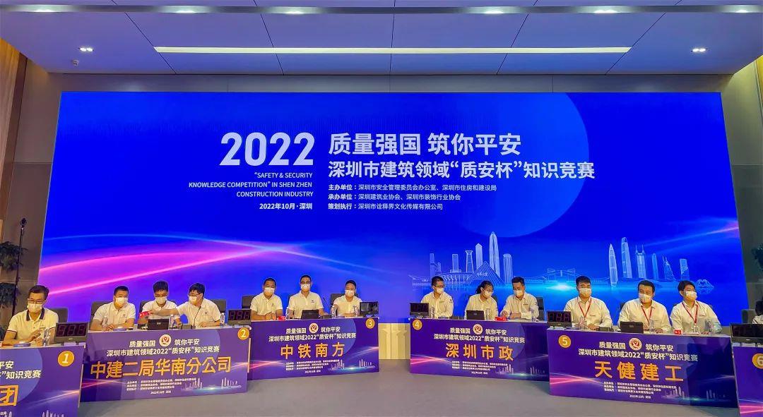 近日,由深圳市安全管理委员会办公室、深圳市住房和建设局主办,深圳建筑业协会、深圳市装饰行业协会承办的深圳市建筑领域2022年“质安杯”知识竞赛在深举行,中铁南方凭借优异成绩从全市近百家参赛建筑企业中脱颖而出,荣获企业组第二名。