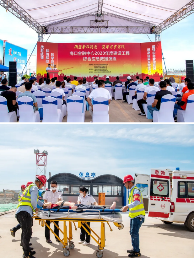 为贯彻落实第19个全国“安全生产月”系列活动,切实提升在建项目全体人员应急知识和自救互救能力。6月24日,中铁海南指挥部联合中铁广州局在海口金融中心项目举行建设工程综合应急救援演练。