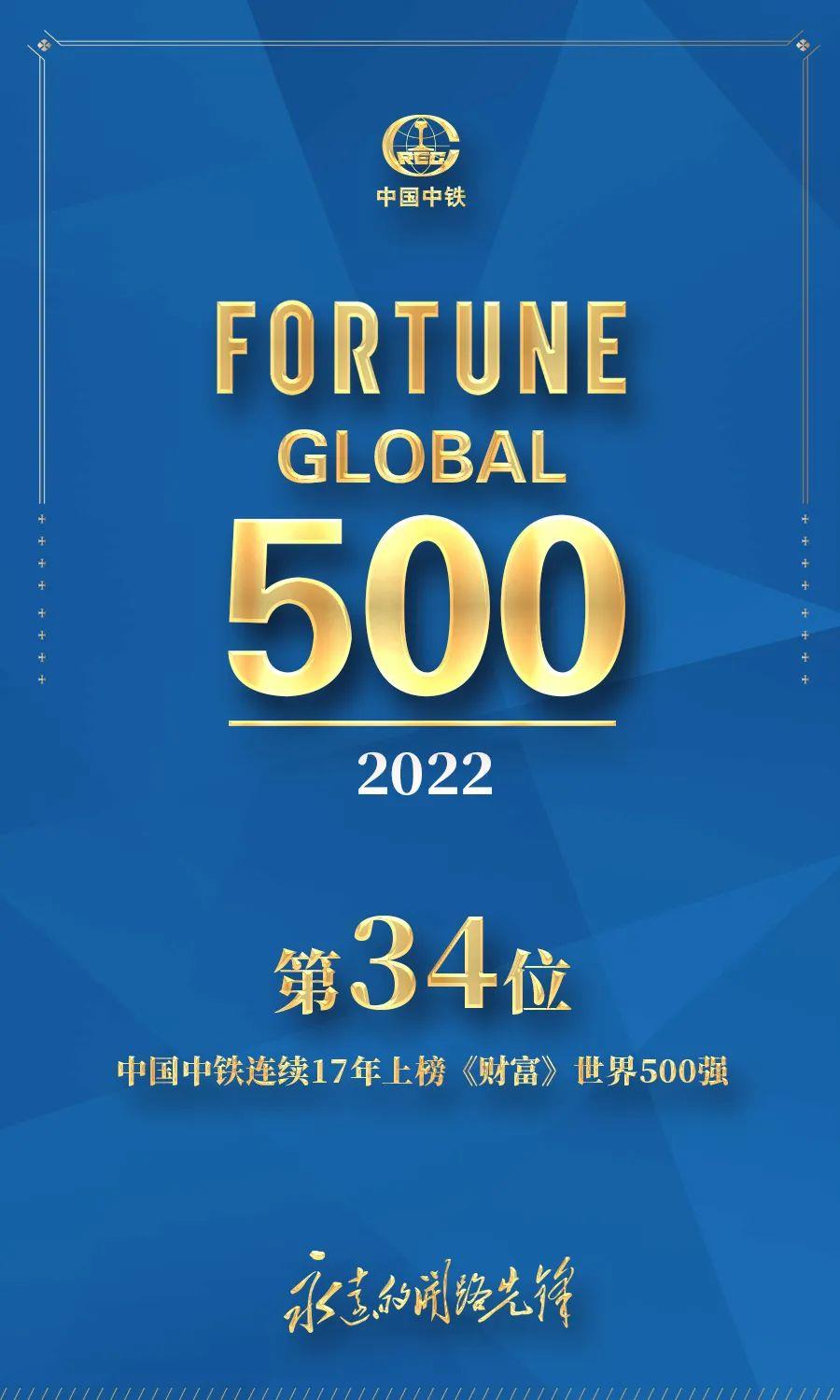 月3日,2022年《财富》世界500强排行榜正式揭晓,中国中铁排名第34位,较去年上升1位,持续刷新历史最好成绩,这也是中国中铁自2006年以来连续第17年跻身世界500强。