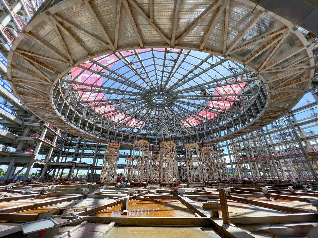 本次观摩的海南银行总部大楼项目由中铁南方代管、中铁广州局承建,项目位于海口市江东新区起步区,占地面积2.1万多平方米,总建筑面积约9.1万平方米,是集行政运营中心、科技信息中心、国际金融交流中心、自由贸易港金融机构服务基地等功能为一体的综合性大楼。该大楼造型独特、设计新颖,特别是直径64.4米、重约1000吨的圆形穹顶由“环廊马道+屋顶网壳+中部排烟窗”组成,工艺要求高、安全风险大,在海南省同类型施工中属首例。