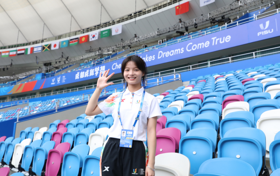 中铁九局五公司青年职工资文静受成都团市委抽调,下沉至大运会开幕式主场馆——东安湖体育公园,作为大运会志愿者组的工作专员,协助各用人组做好志愿者管理工作,同时和其他大运会志愿者组的工作人员一道,服务和管理参与开幕式的约4000名志愿者,协调志愿者们在各个岗位做好应急和保障服务工作。