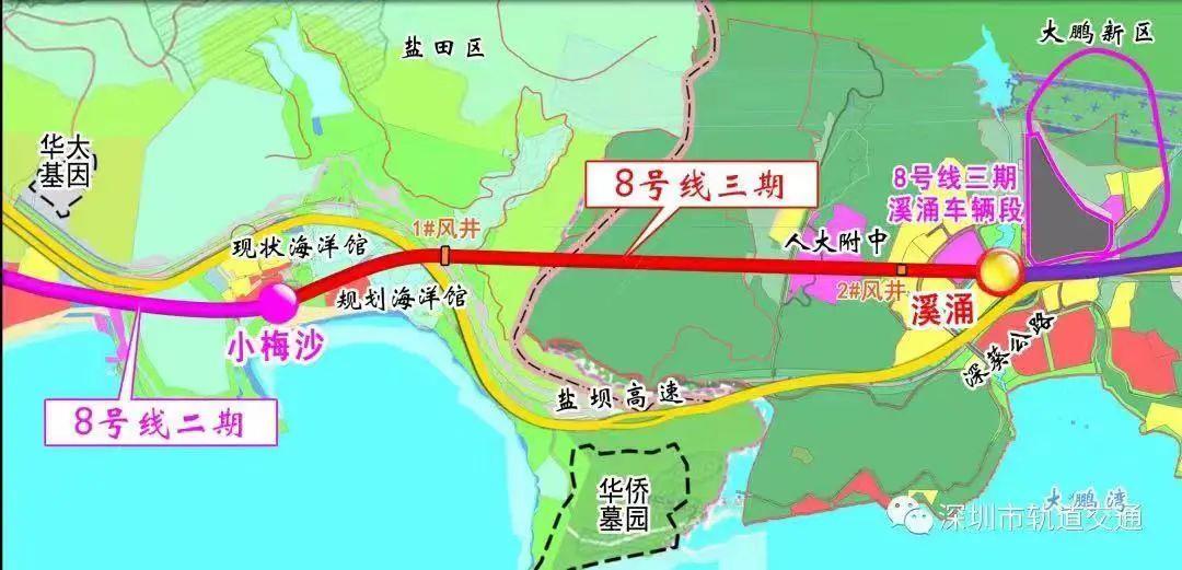 深圳地铁8号线三期项目起于盐田区8号线二期小梅沙站,止于大鹏新区溪涌站,全长约3.7千米。建成通车后,8号线三期与一期、二期,2号线及2号线三期工程线路贯通运营,将形成贯通南山、福田、罗湖、盐田和大鹏新区的轨道交通骨干线路。届时,该线路成为贯穿深圳市东西的轨道交通干线走廊,有效服务于盐田、大鹏新区的主要通勤客流,同时兼顾东部沿海地区的旅游客流。对大鹏新区建设全球海洋中心城市集中承载区和世界级滨海生态旅游度假区,具有重要支撑和促进作用。