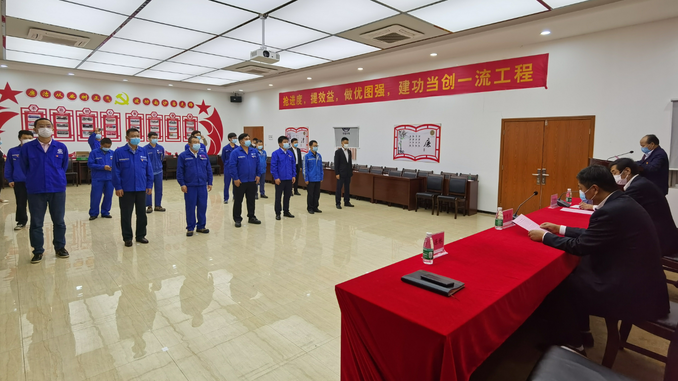 授旗仪式上,由大岗总包部总工程师宣读了“倡议书”,向所有党组织和党员发出“八带头”倡议,动员党员同志们迅速行动,坚定扛起政治责任、坚决服从防疫复工大局,坚决打赢防控阻击战和发展总体战。随后,大岗项目部分部党员代表做“请战”发言,将用三个“坚决做到”积极投入这场没有硝烟的战斗,愿意不计得失、不辱使命,恪尽职守、全力以赴,坚决打赢疫情防控阻击战,为项目顺利完成年度生产任务而保驾护航。