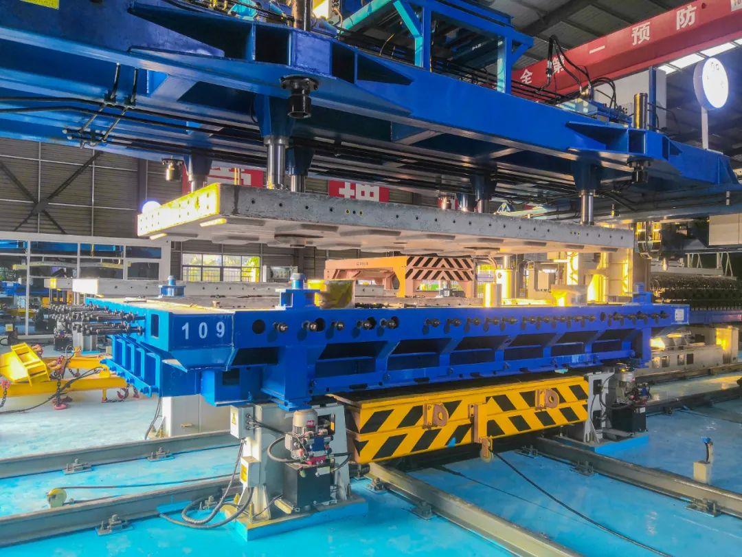 为此,深圳地铁14号线在昂鹅车辆段附近,建设深圳地铁首个轨道板智能预制配送中心——智慧预制轨道板场,承担了全线22736块轨道板预制配送任务。场内配置了业内先进的自动化、智能化流水生产线,实现轨道板模具管理、钢筋骨架安装、钢筋张拉、混凝土浇筑振捣、轨道板养护及管理等全过程自动化、智能化,达到了轨道板场全要素在线统一集中管理、关键设备集中控制、工序信息自动采集、过程数据互联互通、产品质量可追溯的效果。较于传统“台座法”生产效率提高20%,机械化自动化操作可节约人工约50%。