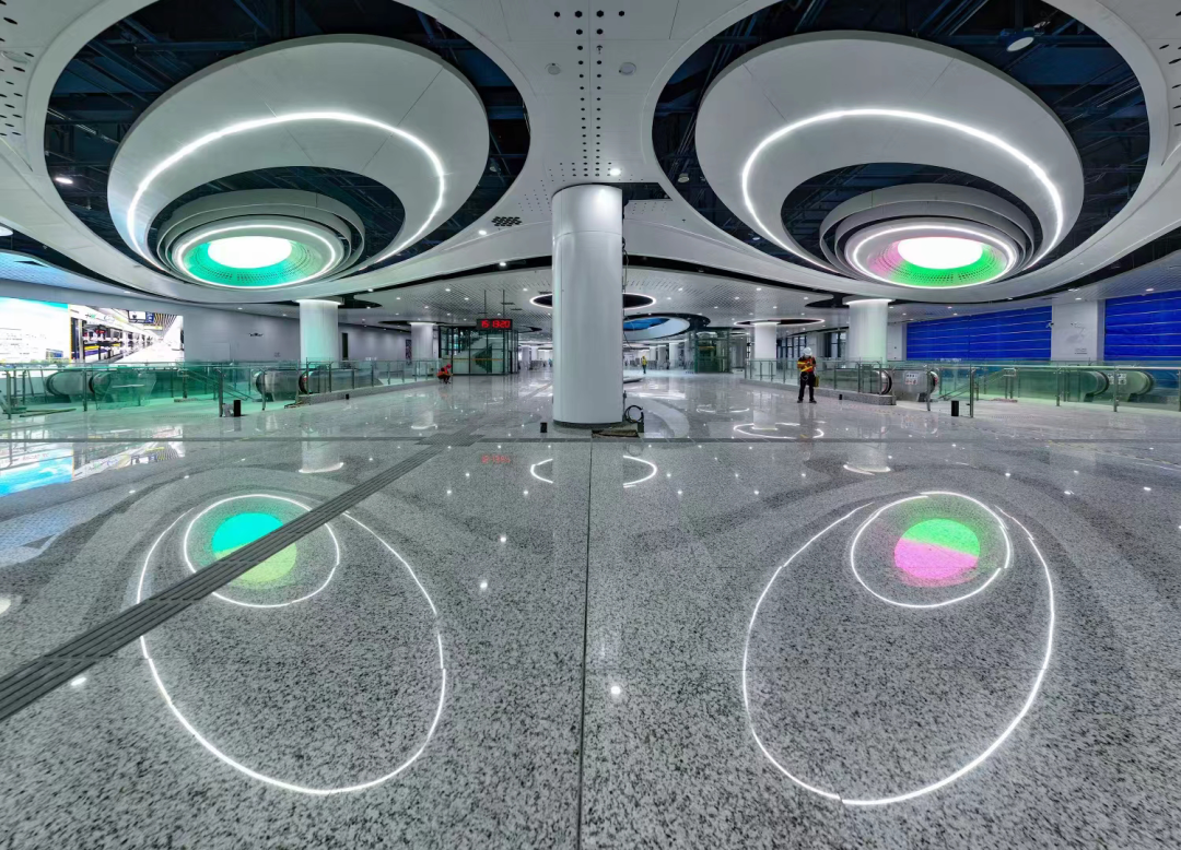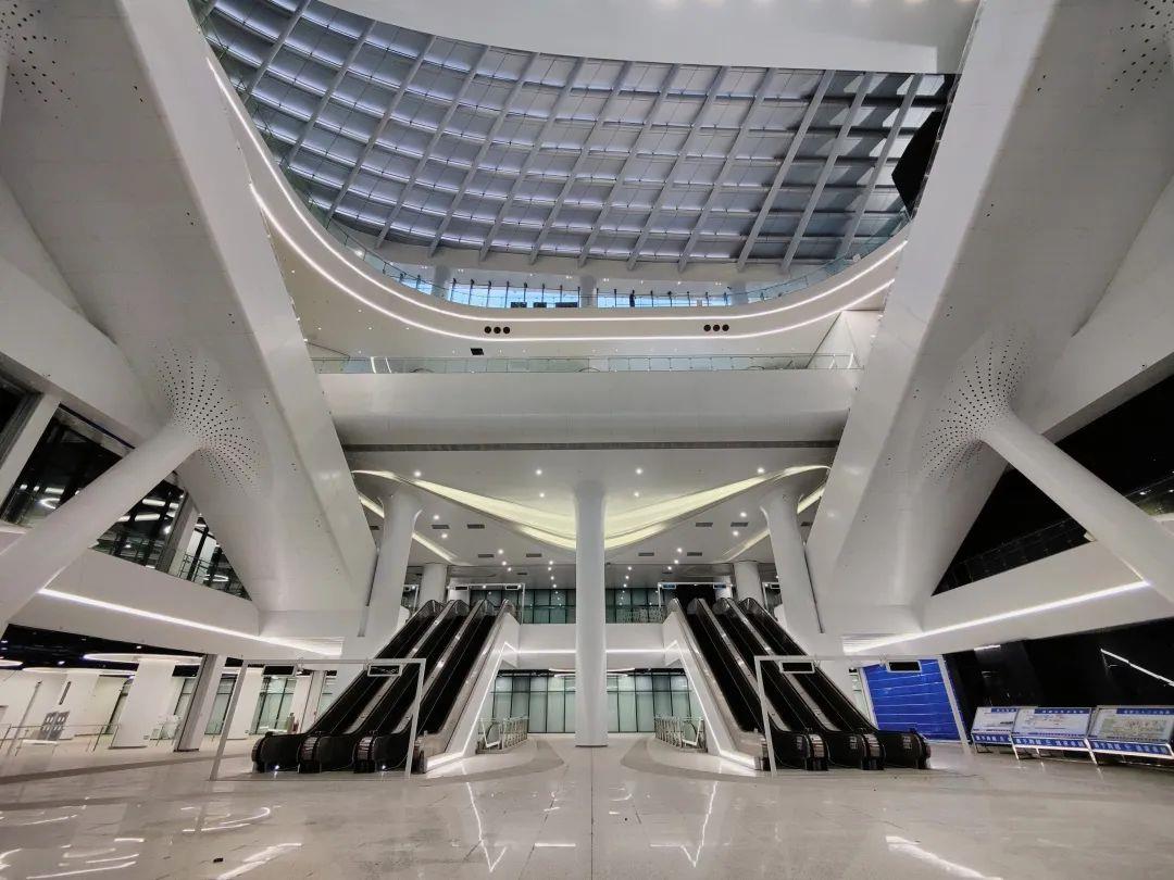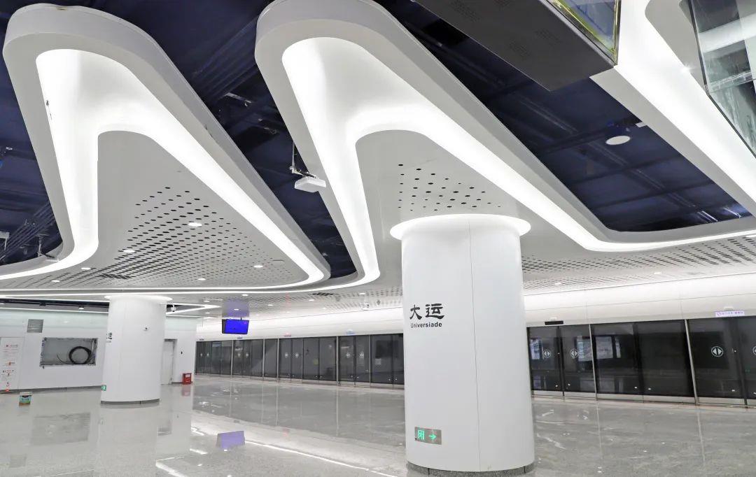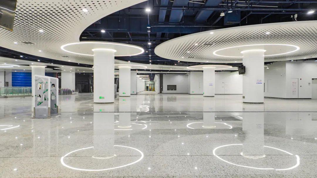 建设者们还通过运用综合支吊架、深建立BIM模型开展碰撞模拟等,解决了大运枢纽管线管道多而杂,施工作业面空间狭小的限制,既节省了空间和材料,减少专业间的协调工作量,又使各专业管线管道排布合理美观。在安装装修施工时,通过采用预制加工厂模块化预制、物流化运输、装配化施工,不仅节约了时间,减少现场加工量,而且优化了车站地面、墙面与天花吊顶的布局,使整个车站在视觉上更加大气美观。
