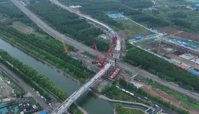7月4日,经过一个半小时的紧张施工,中铁十局承建的济郑高铁山东段跨小清河特大桥上跨京沪铁路三、四线桥钢板梁顺利吊装完成,为济郑高铁山东段按期开通奠定基础。此次吊装施工的钢板梁重量达460吨,创造国内上跨既有线铁路桥钢板梁吊装重量最大的施工纪录。同时,吊装施工采用国内罕见的2000吨级超大型履带式起重机进行作业,履带吊自身重量、吊装半径、钢板梁重量均为济郑高铁全线之最。