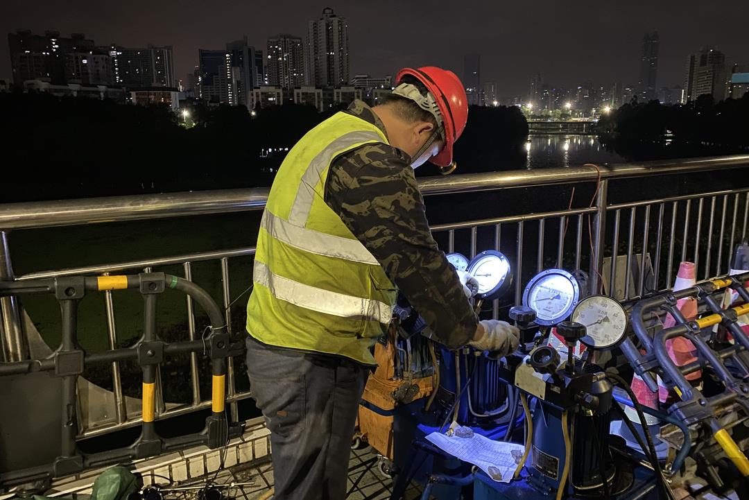 施工中,不断对施工方案进行优化、细化、量化,充分利用夜间施工5个半小时,合理布置每道施工工序,加大现场机械设备及施工人员投入,保证大桥吊杆更换施工安全顺利进行,力争早日完成吊杆更换,造福市民群众。