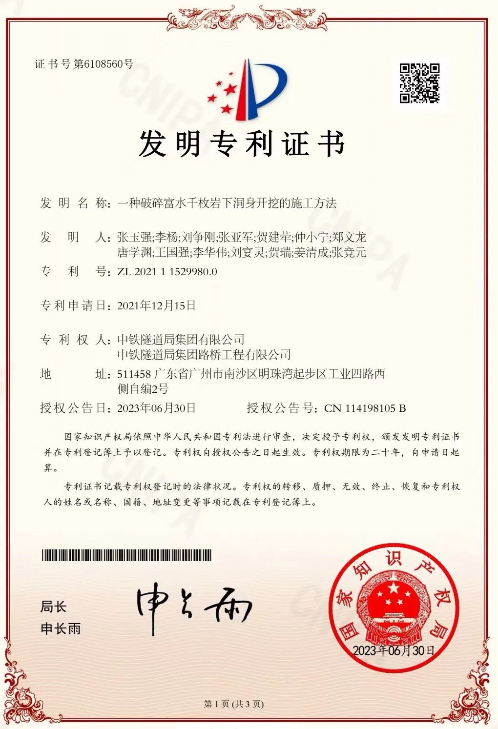 近日,中铁隧道局路桥公司西(昌)昭(通)高速项目部一分部传来喜讯,由“刁国君劳模工作室”西昭项目团队开展技术攻关的“一种破碎富水千枚岩下洞身开挖的施工方法”被国家知识产权局正式授权公告为国家发明专利,这是“刁国君劳模工作室”成立以来累计获得的第十三项国家专利,也是第四项国家发明专利。