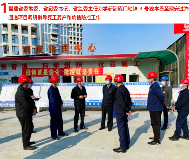 2 月 19 日,福建省委常委、省纪委书记、省监委主任刘学新到中国中铁厦门地铁 3 号线本岛至翔安过海通道项目调研指导复工复产和疫情防控工作,听取项目疫情防控和工程复工情况介绍,对项目“早部署、重落实”的疫情防控工作和克服困难、有序复工工作予以充分肯定。