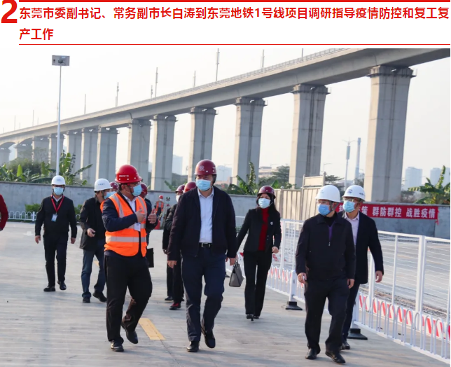 2 月 20 日,东莞市委副书记、常务副市长白涛到中国中铁东莞地铁1号线一期工程 1301 标段调研指导疫情防控和复工复产工作,听取项目负责人关于疫情防控、工人返岗、复工复产、安全管控等方面的情况汇报,检查了信息智能化预制梁场施工生产和工人隔离区硬件配置,对中国中铁提前部署、统筹协调,迅速有效采取有力措施,强化疫情防控和复工复产工作表示肯定。