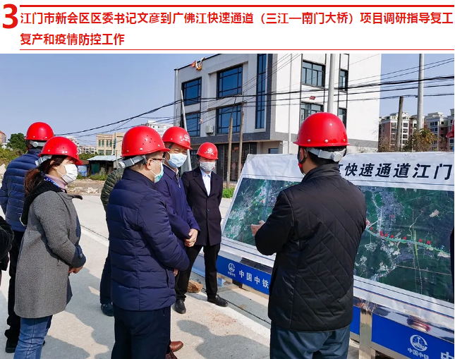 2月17日,江门市新会区区委书记文彦到中国中铁广佛江快速通道(三江—南门大桥)项目调研指导复工复产和疫情防控工作,查看项目疫情防控和复工复产情况,统筹协调解决项目复工复产面临的原材料供应等困难。