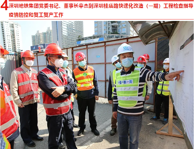 2 月 21 日,深圳地铁集团党委书记、董事长辛杰到中国中铁桂庙路快速化改造(一期)工程地铁共线段项目检查指导疫情防控和复工复产工作,先后查看了项目人员实名登记、体温检测、防疫消毒、防疫物资发放等措施落实情况,详细了解了人员到位、工程进展、防疫物资储备、原材料进场等情况。