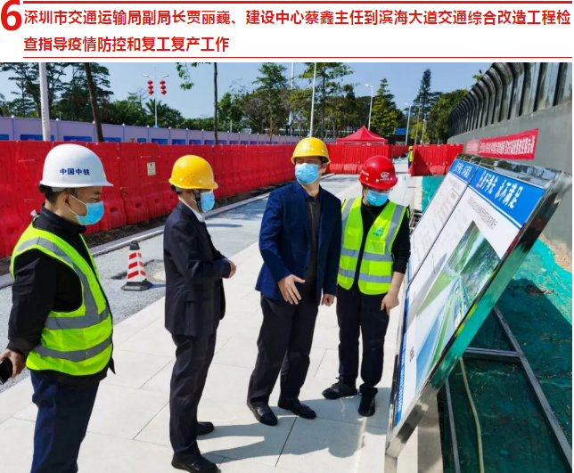 2 月 21 日,深圳市交通运输局副局长贾丽巍、建设中心蔡鑫主任到滨海大道交通综合改造工程检查指导疫情防控和复工复产工作,详细了解施工人员到场、疫情防控物资储备、员工生活和生产防疫措施落实等情况,并听取了项目建设进展、疫情防控及安全生产情况汇报。