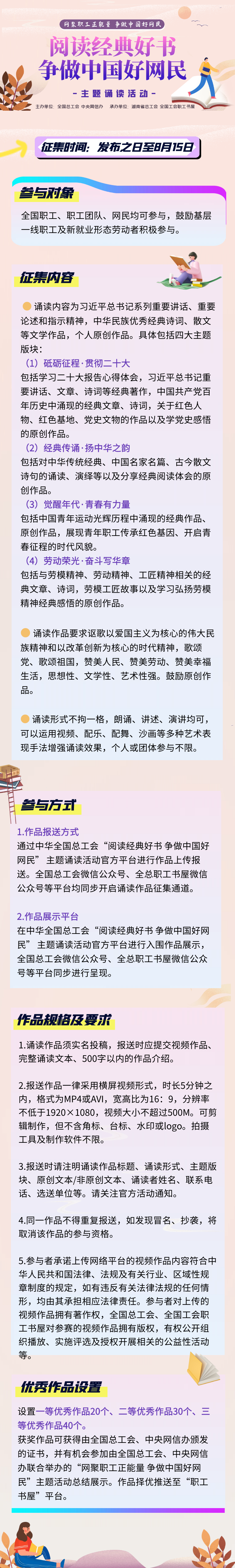 通过初步审核后评出120部作品在中华全国总工会“阅读经典好书 争做中国好网民”主题诵读活动官方平台进行展示,全国工会职工书屋官方平台也将同步呈现。届时根据观看、分享、点赞、留言等综合情况进行网络评选,同时邀请专家组进行作品评审。