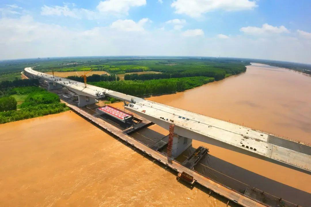滨州黄河大桥位于山东省滨州市,由于黄河下游不具备通航条件等特殊地理环境限制,主桥钢箱梁无法开展水上运输及吊装,项目团队创新采用“钢箱梁原位拼装,自锚式整体提升”新工法进行安装架设,有效压缩了施工工期,确保项目按期合龙。项目建成后,日通车能力可达万余辆,能够打通鲁中与鲁北间的阻隔,有效满足山东省跨黄河交通量快速增长的需要,破除城市“夹河而建,跨河发展”的瓶颈制约,有利于地区经济加速发展。