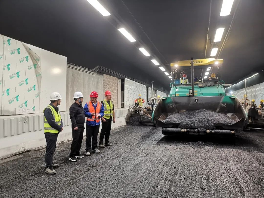 建设过程中,项目管理团队与各方进行多次紧密沟通,不断优化施工方案和组织,在春节前成功完成沥青运输车辆改造和隧道内永久通风机调试工作,成功克服了隧道内空间狭小、通风条件受限的难题。以及实现隧道内狭小空间沥青铺设试验段施工,及时总结经验并推广至全线。此外在施工过程中,还采用了先进的3D沥青摊铺机和压路机,确保了沥青混合料的均匀铺设和压实。同时,为了全面保障施工质量,项目管理团队进一步强化了现场的安全监管与质量控制体系落地,安全优质高效推进施工。