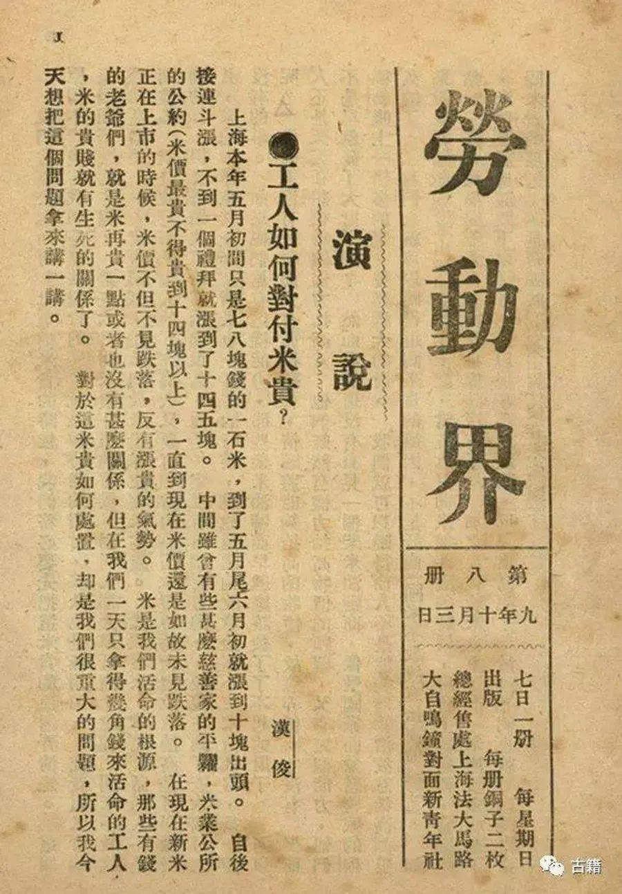 1920 年 8 月,陈独秀在《劳动界》上发表了题为《真的工人团体》的文章,指出:工人不结团体不行,呼吁工人,“联合起来”,“组织真的工人团体”!1920 年 11 月 21 日,中国共产主义者领导建立的第一个现代工会——上海机器工会宣告成立。在上海机器工会召开的第一次筹备会议上,海军造船厂工人、筹备会主席李中就公开声明,上梅机器工会的宗旨是“谋本会会员底利益,除本会会员的痛苦”。《共产党》月刊发表文章称赞它办得很有精神色彩。