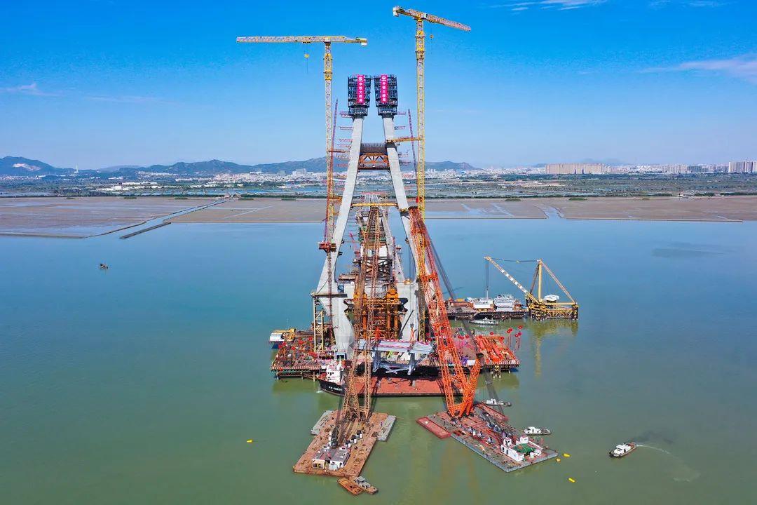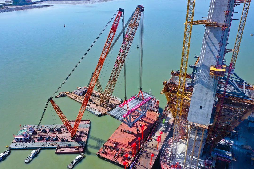11月10日,由中铁南方投资建设、中铁大桥局承建的汕头牛田洋快速通道重点控制性工程——牛田洋特大桥首节钢桁梁成功架设,标志着大桥建设取得新的重大进展。